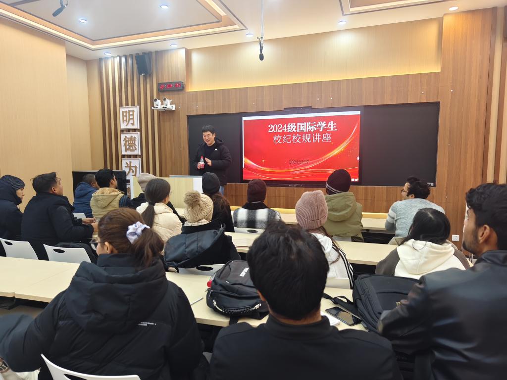为进一步提升我校国际学生培养的质量和水平,加强国际学生日常管理,11月27日上午,对外交流合作处组织开展了2024级国际学生校纪校规专题讲座。对外合作交流处马明处长出席,华中农业大学援疆干部王中舰老师主讲。国际学生辅导员及全体2024级国际学生参加。