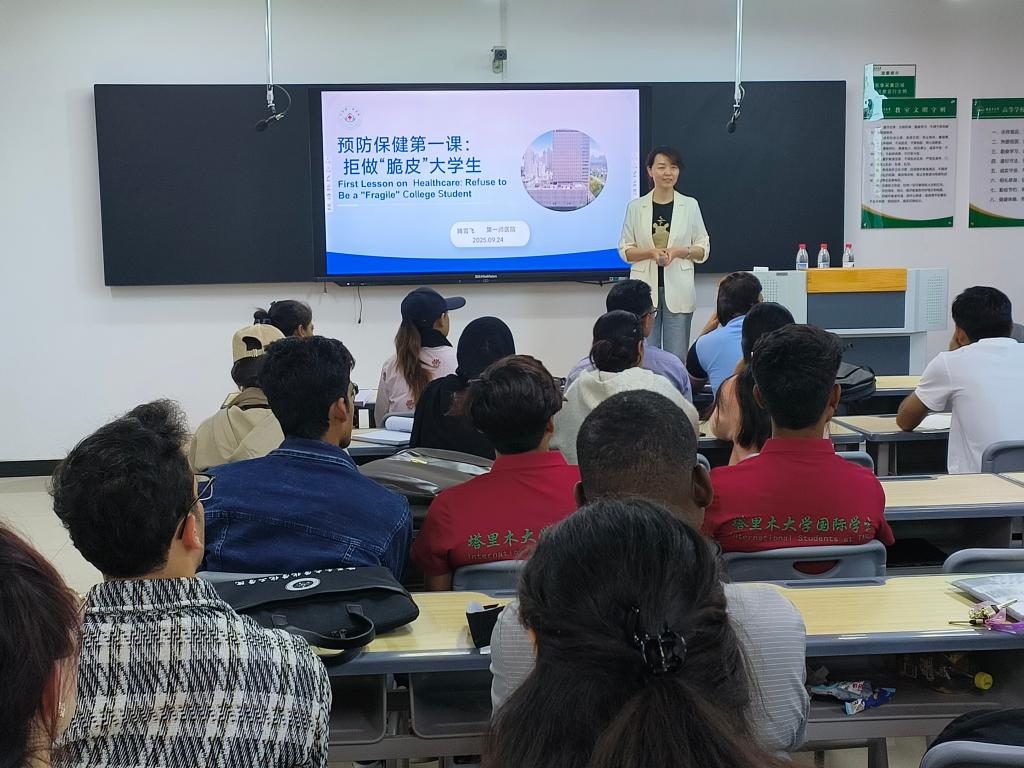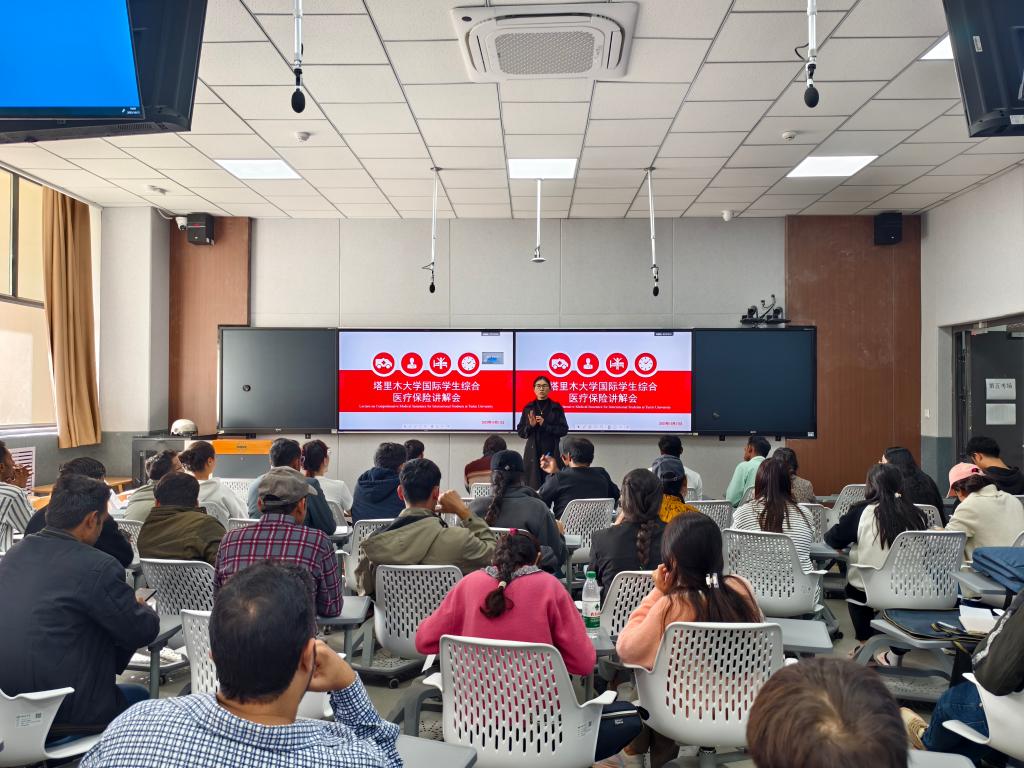 9月24日,对外交流合作处特别邀请了第一师医院公共卫生科主任腾雪飞医生,给新生们安排了“预防保健第一课”主题讲座。腾雪飞就常见疾病预防、合理膳食、心理健康调适等内容进行了专业指导。此外,留学生生活指南讲座和学长学姐经验分享会活动则更贴近实际需求,前者从住宿、饮食、交通、通讯等日常事务入手,提供了实用的生活信息;后者邀请了优秀学长学姐现场分享学习技巧、科研方法及跨文化交际心得,并通过"手把手"的互动形式,解答了新生们在学业和生活上的疑惑。为帮助学生详细了解医保流程与权益,对外交流合作处邀请承保保险公司-中国平安财产保险股份有限公司经理给留学生进行了综合医疗保险政策宣讲活动。保险公司王碧云经理以"保障范围-理赔流程-实操技巧"为主线,通过数据图表与案例解析相结合的方式展开讲解。