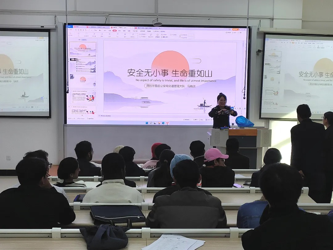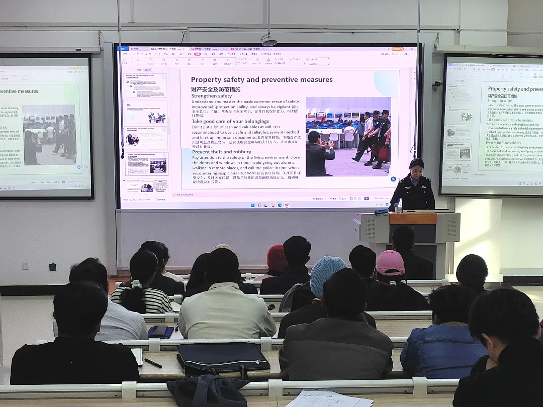 第一师阿拉尔市公安局民警结合《中华人民共和国出境入境管理法》《中华人民共和国网络安全法》《中华人民共和国道路交通安全法》等法律法规,通过案例分析、情景模拟、有奖竞答等方式,重点围绕网络安全、交通安全、财务安全、居留许可办理、防范电信诈骗等内容,详细讲解留学生在华学习生活期间需要遵守的相关法律法规,让留学生直观理解中国法律的边界与底线,引导学生提高知法守法意识,努力学习专业知识的同时多参加课外活动,多了解真实的中国。